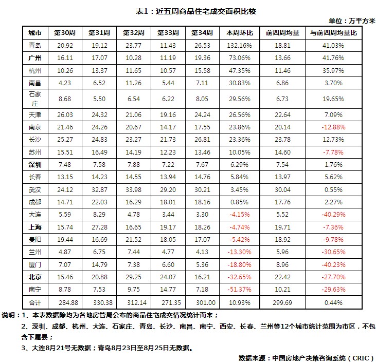 與前四周平均成交面積相比,本周成交面積微漲0.44%。11城市高于前四周成交均量,廣州以41.76%漲幅居首;9城市下滑,除大連數據異常外,廈門以-40.23%跌幅居首。