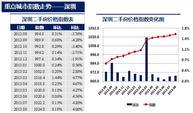 2013年8月,深圳二手房價(jià)格指數(shù)為1024.0點(diǎn),較上月上升了1.8點(diǎn),環(huán)比上漲0.18%,漲幅較上月擴(kuò)大了0.03個百分點(diǎn),同比上漲4.06%。