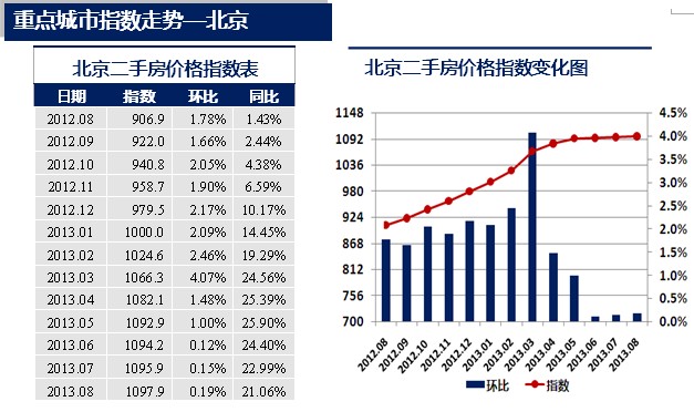 2013年8月,北京二手房交易價(jià)格指數(shù)為1097.9點(diǎn),較上月上升2.0點(diǎn),環(huán)比上漲0.19%,漲幅較上月擴(kuò)大了0.04個百分點(diǎn)。同比上漲21.06%。