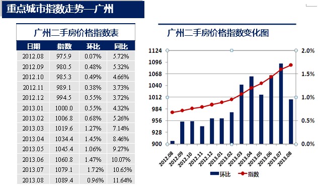 2013年8月,廣州二手房價(jià)格指數(shù)為1089.4點(diǎn),較上月上升10.3點(diǎn),環(huán)比上漲0.96%,漲幅較上月縮小了0.76個百分點(diǎn)。同比上漲11.64%。