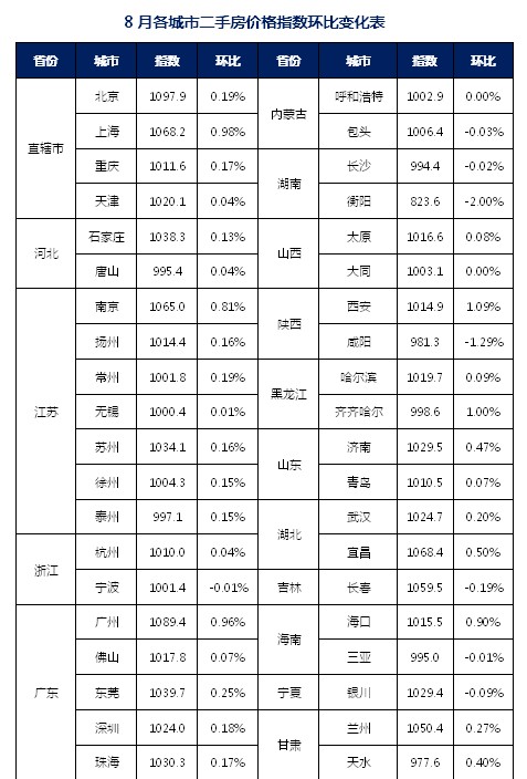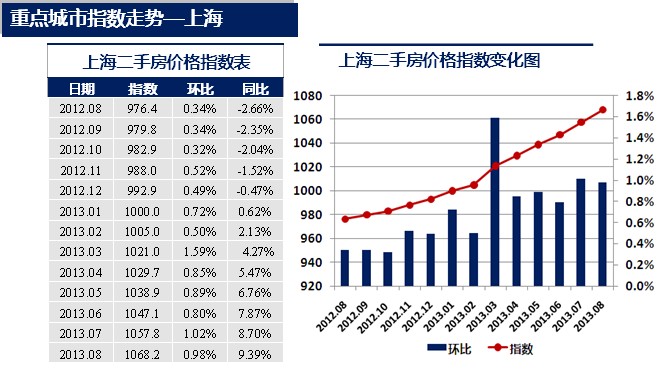 2013年8月,上海二手房價(jià)格指數(shù)為1068.2點(diǎn),較上月上升10.4點(diǎn),環(huán)比上漲0.98%,漲幅較上月縮小了0.04個百分點(diǎn)。同比上漲9.39%。