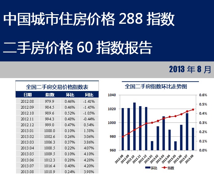 2013年8月,中國城市住房價(jià)格288指數(shù)——二手房價(jià)格60指數(shù)為1018.9點(diǎn),較上月上升2.5點(diǎn),環(huán)比上漲0.24%,漲幅較上月縮小了0.16個百分點(diǎn),同比上漲3.98%。指數(shù)環(huán)比數(shù)據(jù)延續(xù)了近一年來的上漲走勢。