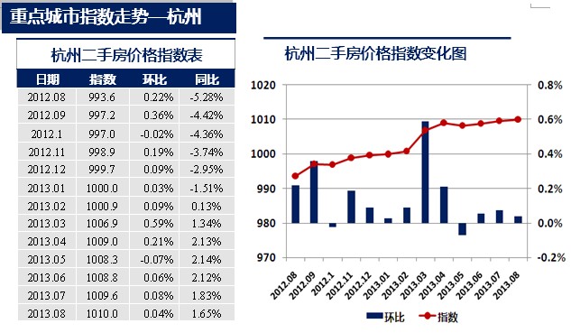 2013年8月,杭州二手房價(jià)格指數(shù)為1010.0點(diǎn),較上月上升了0.4點(diǎn),環(huán)比上漲0.04%,漲幅較上月縮小了0.04個百分點(diǎn),同比增長1.65%。